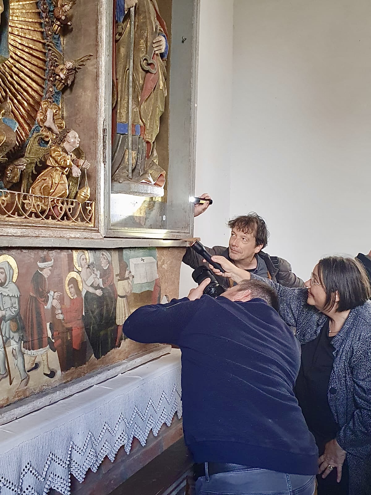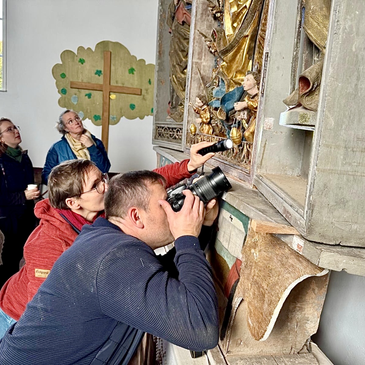 „Bei der Tagung ging es vor allem um Kunstwerke, die vom Mittelalter in die heutige Zeit überkommen sind. Davon gibt es mittlerweile nicht mehr sehr viele. Unsere Region war mal katholisch, aber durch die Reformation wurden wir protestantisch, also evangelisch. Viele Kunstwerke, also Altäre und Skulpturen, sind damit aus den Kirchen rausgeräumt worden, andere verschwanden über die Zeit durch Verfall und Diebstahl. Bei der Tagung ging es nun darum, aus denkmalpflegerischer Sicht zu gucken, wie solche Schätzeauch mit ihren originalen Farbfassungen konserviert und restauriert werden können“, erklärt Gordon Thalmann, Sachbereichsleiter Denkmalschutz des Landkreises Prignitz. „Nur fünf bis zehn Prozent von originalen mittelalterlichen Fassungen sind überhaupt noch vom Gesamtbestand in Norddeutschland erhalten. Das ist nicht viel. Deswegen ist es auch eine denkmalpflegerische Aufgabe, diese Originalfassungen mit den Vergoldungen und Punzierungen zu erhalten.“