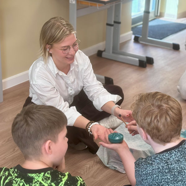 Über Schiebetüren gelangen die Jungen und Mädchen direkt auf die Terrasse und den zukünftig geplanten Spielplatz. Dachfenster und eine große Glasfront mit Schiebetüren fluten die Räume mit natürlichem Licht. Das schafft eine helle und freundliche Atmosphäre und bietet zudem einen schönen Ausblick auf die umliegende Natur. Etwas, wovon sie bereits öfters profitieren konnten. Denn nicht nur die Schülerinnen und Schüler haben sich bereits voll eingelebt: Sie teilen sich den Campus mit „Familie Albert“, einer Feldhasenfamilie, die ab und zu vorbeihoppelt und mit ihrem süßen Aussehen den Tag der Kinder versüßt.
